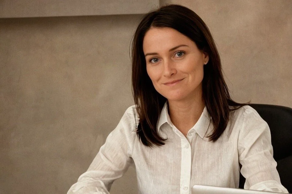 A woman with shoulder-length brown hair, wearing a white button-up shirt, sitting at a desk with a neutral background, smiling slightly at the camera.